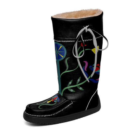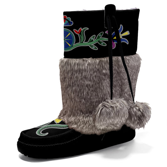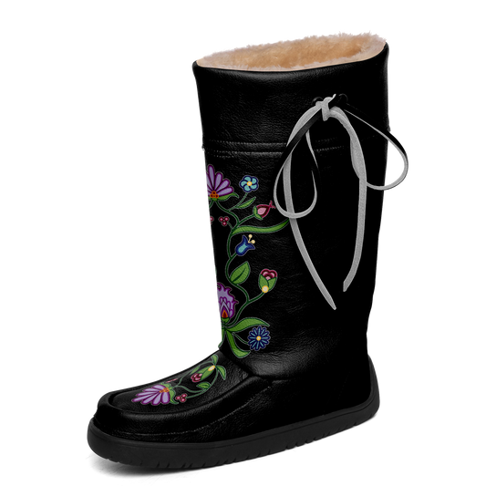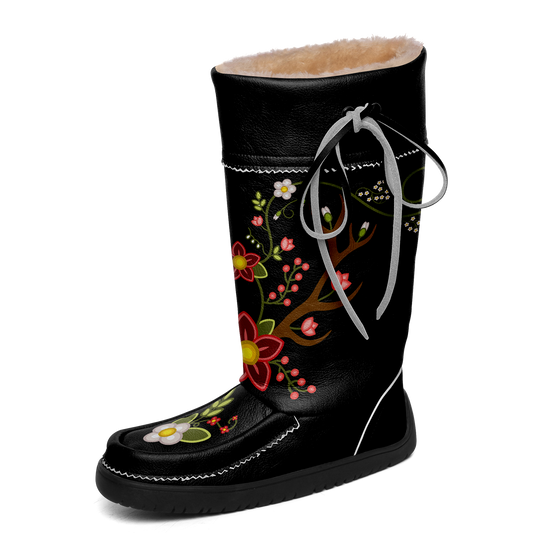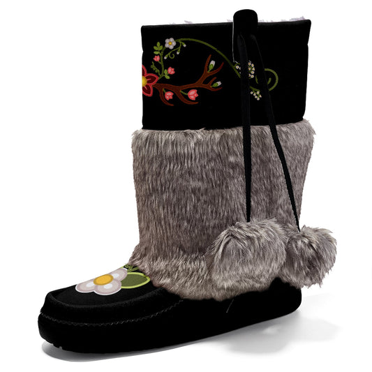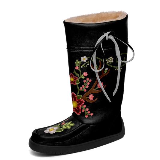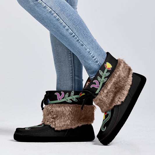 Flower Beadwork People Black Real Leather MocLux with Fur