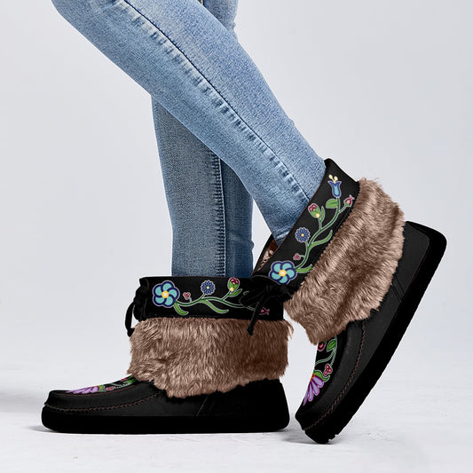Flower Beadwork People Black Leather MocLux Short Style with Fur