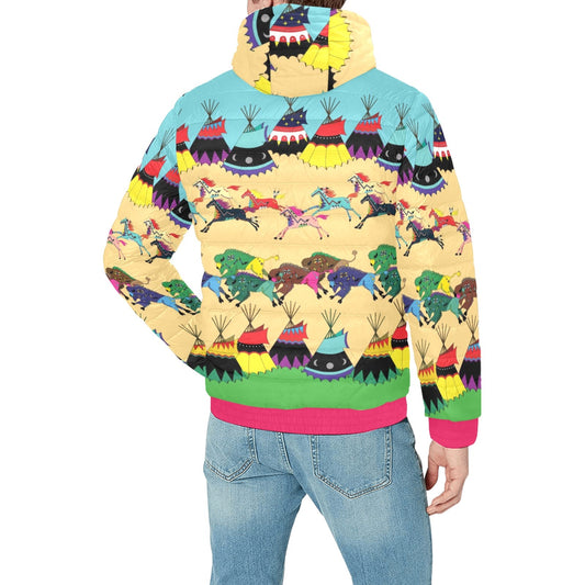 Horses and Buffalo Ledger Pink Men's Padded Hooded Jacket
