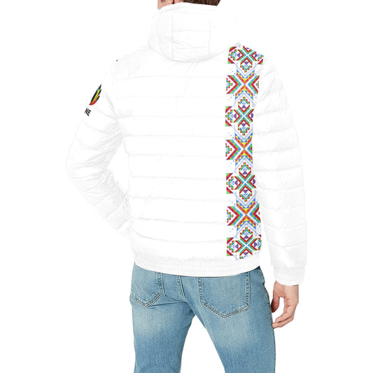 White Blanket Strip on White Men's Padded Hooded Jacket