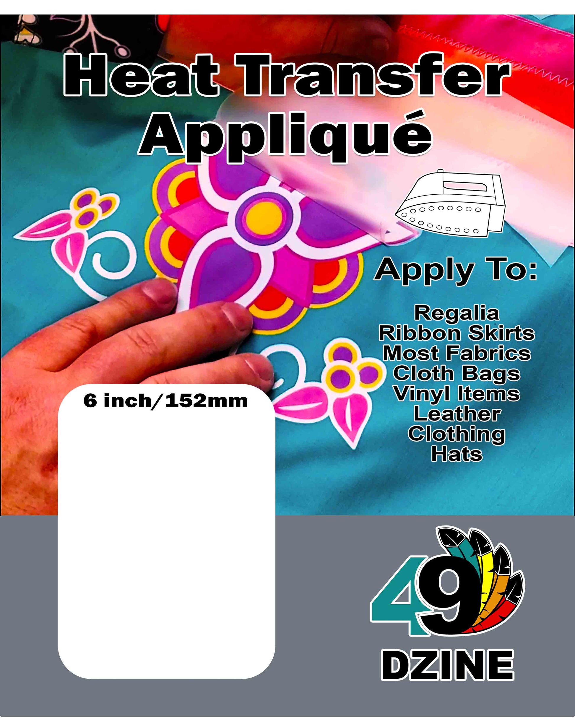 These transfer applique are just like screen prints. You can iron them or heat press them to fabric items. They'll work great on regalia, ribbon skirts, cloth bags, most fabrics, some leathers.