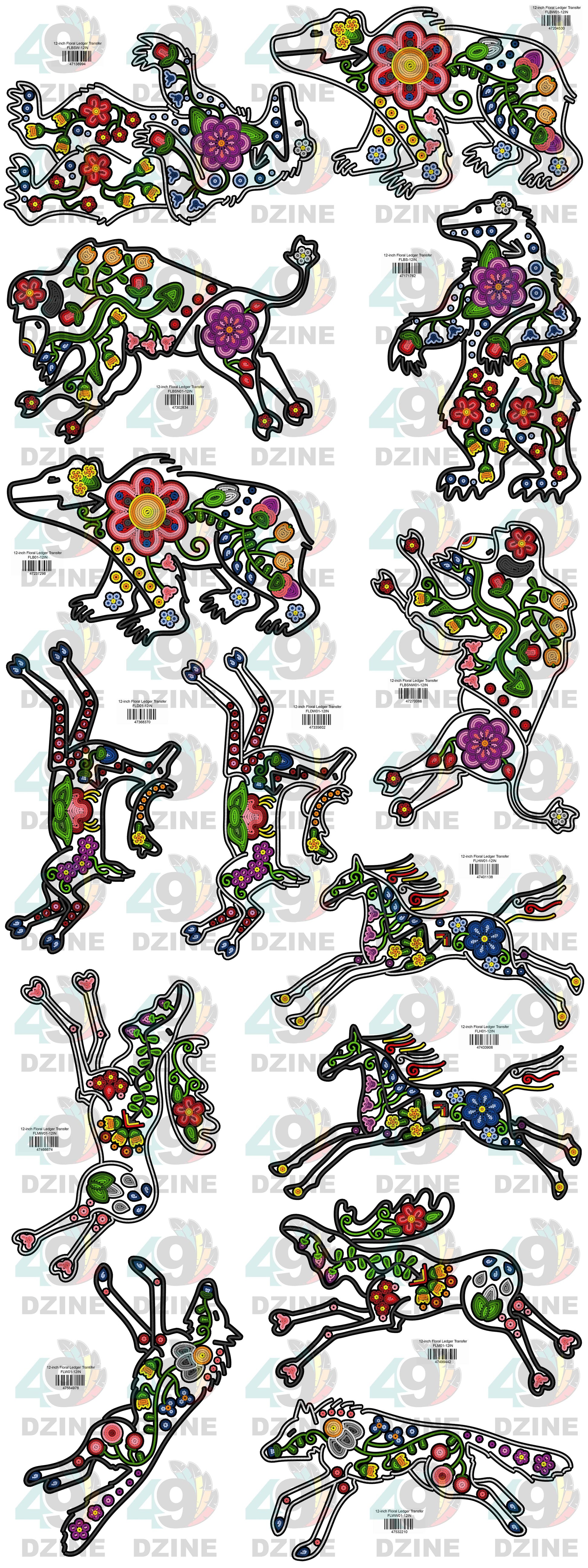 These transfer applique are just like screen prints. You can iron them or heat press them to fabric items. They'll work great on regalia, ribbon skirts, cloth bags, most fabrics, some leathers. If you follow the care instructions, they should last for more than 50 washes. We have created videos and instruction sheets to make them as easy as possible to apply. We also include test transfers you can practice on until you get comfortable applying them. We recommend using teflon sheets when pressing, but you can also use parchment paper. They will save you so much time when making regalia, or dressing up your ribbon skirt. They work great in place of embroidery or traditional silk-screening.