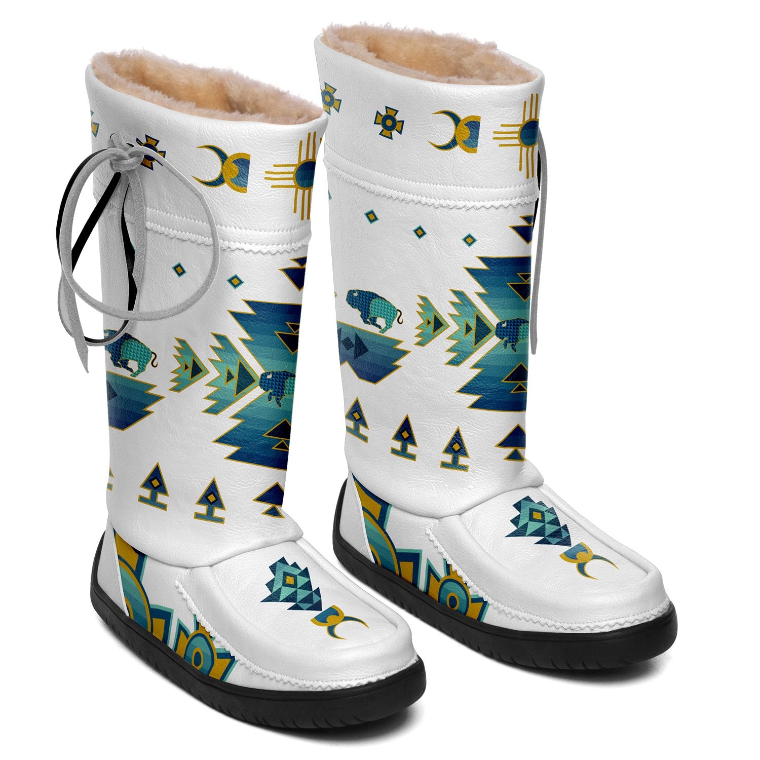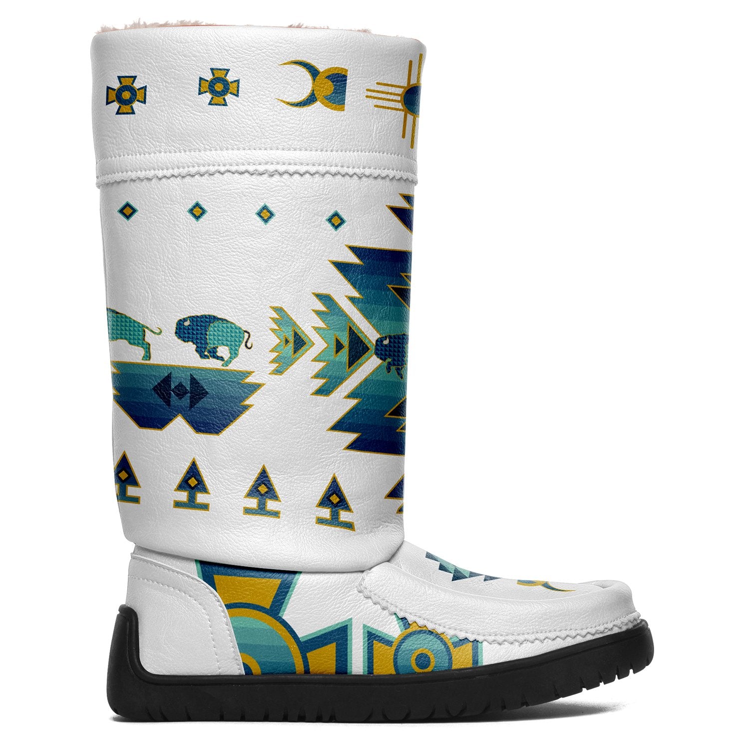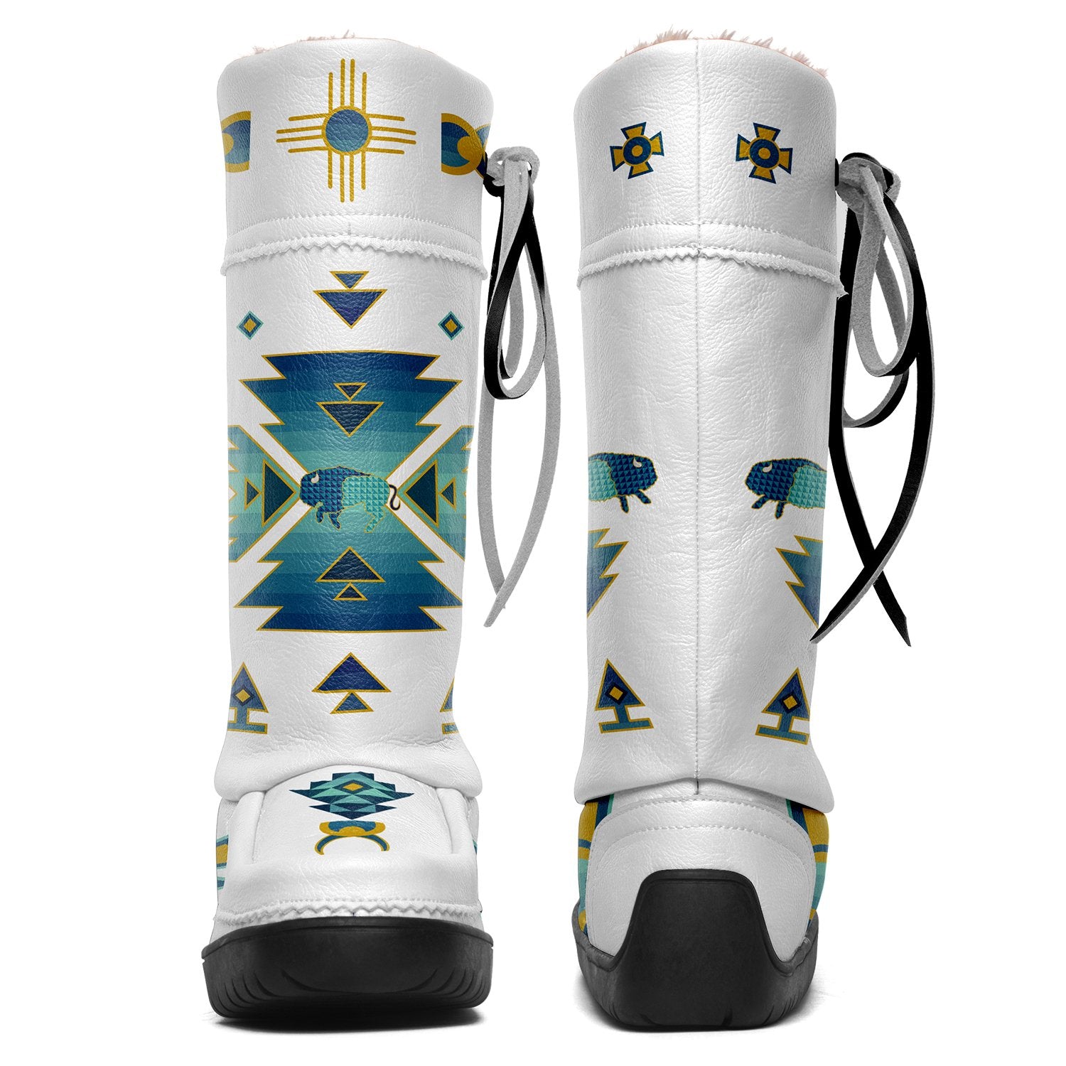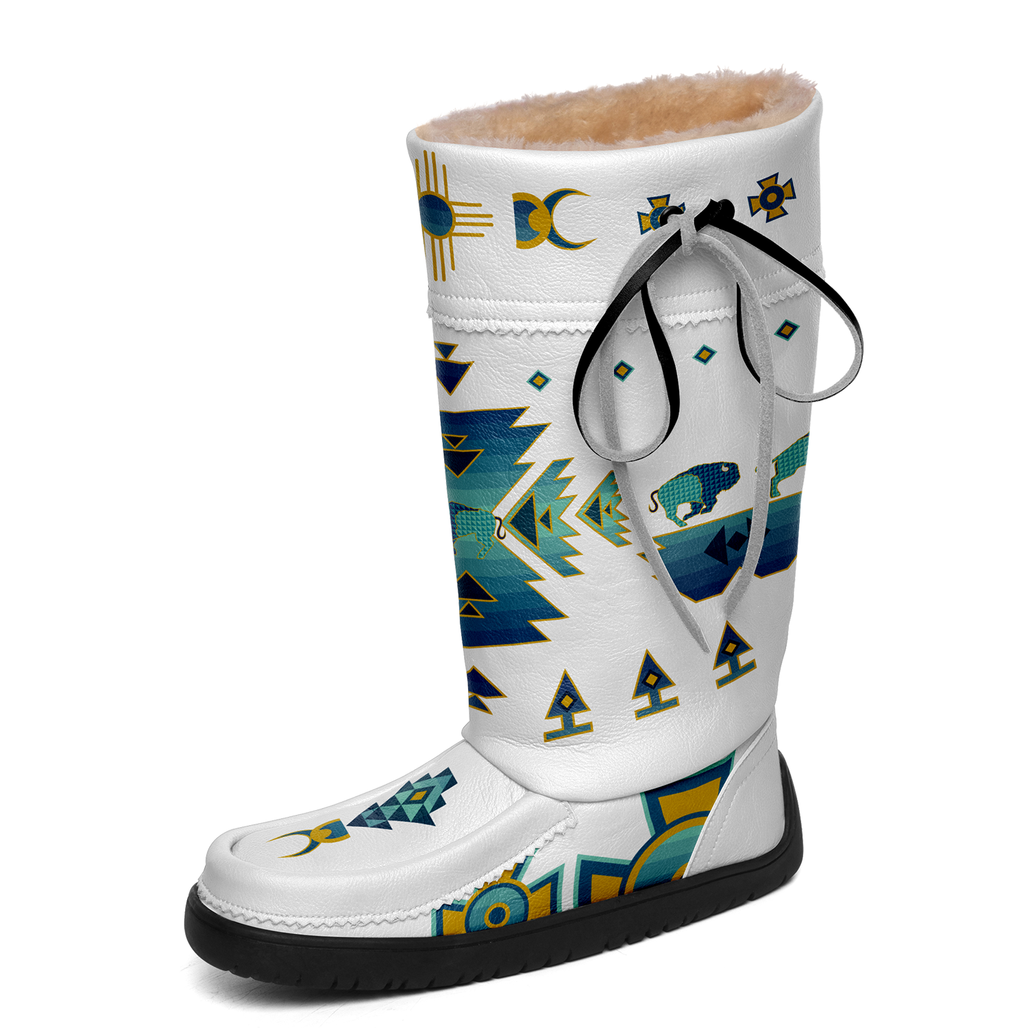 These genuine leather mukluks made exclusively by MocLux for 49 Dzine are designed by Alex Peechow, Thunderchild First Nation.