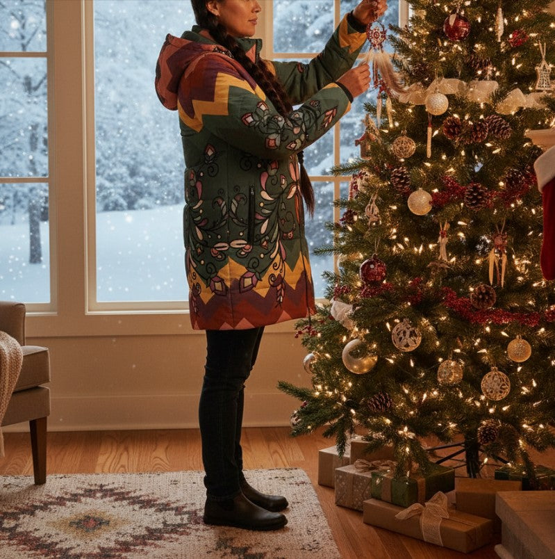 This jacket pairs functional warmth with striking Indigenous-inspired artwork, allowing you to express culture with pride while staying cozy all season long. Whether you choose a bold geometric palette or a floral-based design, it’s more than just a coat—it’s a statement.