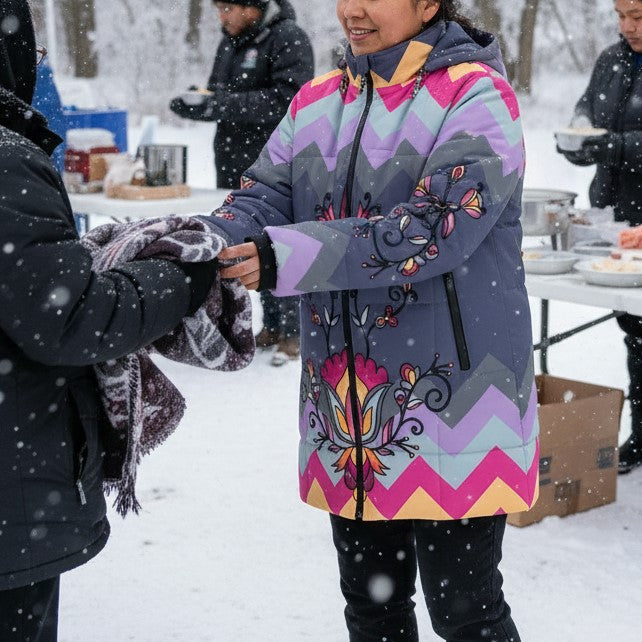 This jacket pairs functional warmth with striking Indigenous-inspired artwork, allowing you to express culture with pride while staying cozy all season long. Whether you choose a bold geometric palette or a floral-based design, it’s more than just a coat—it’s a statement.