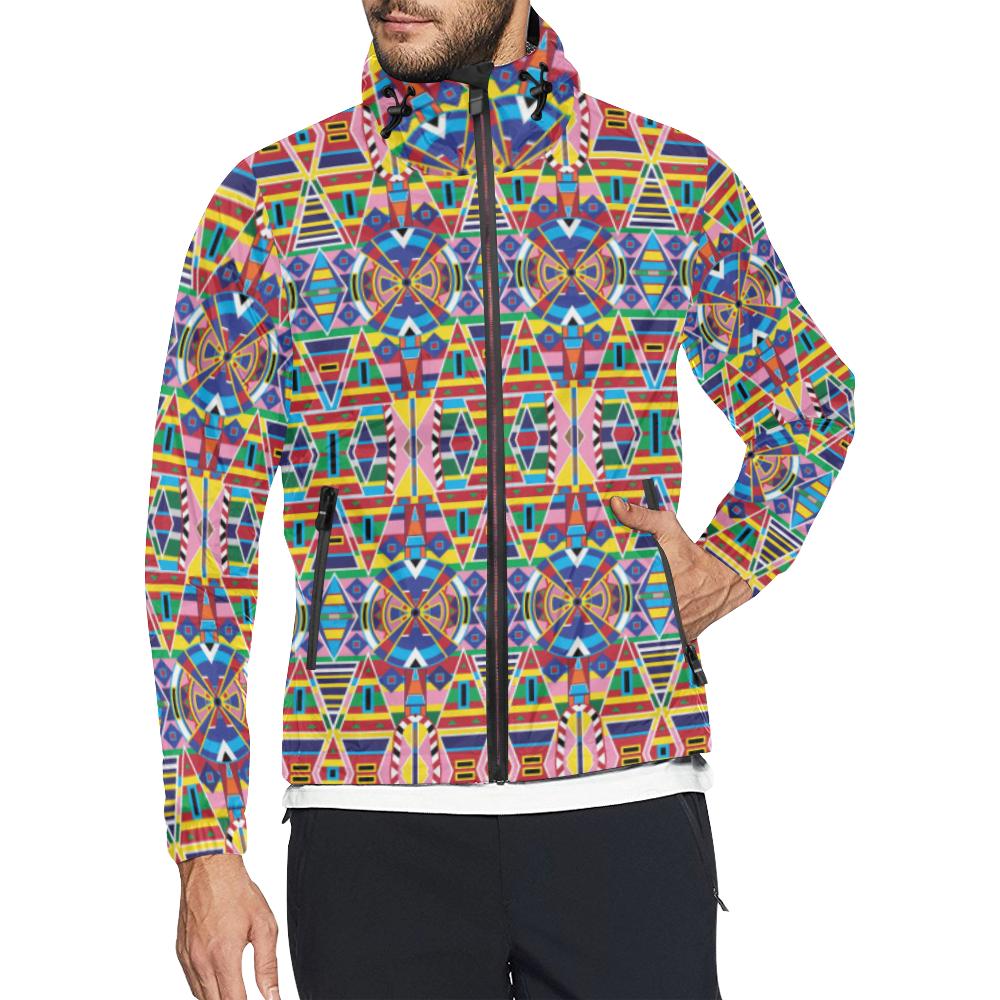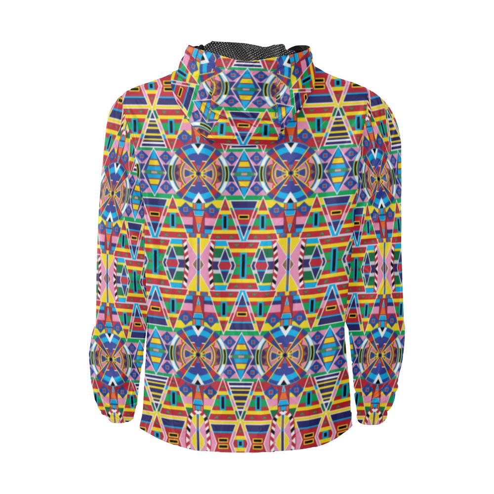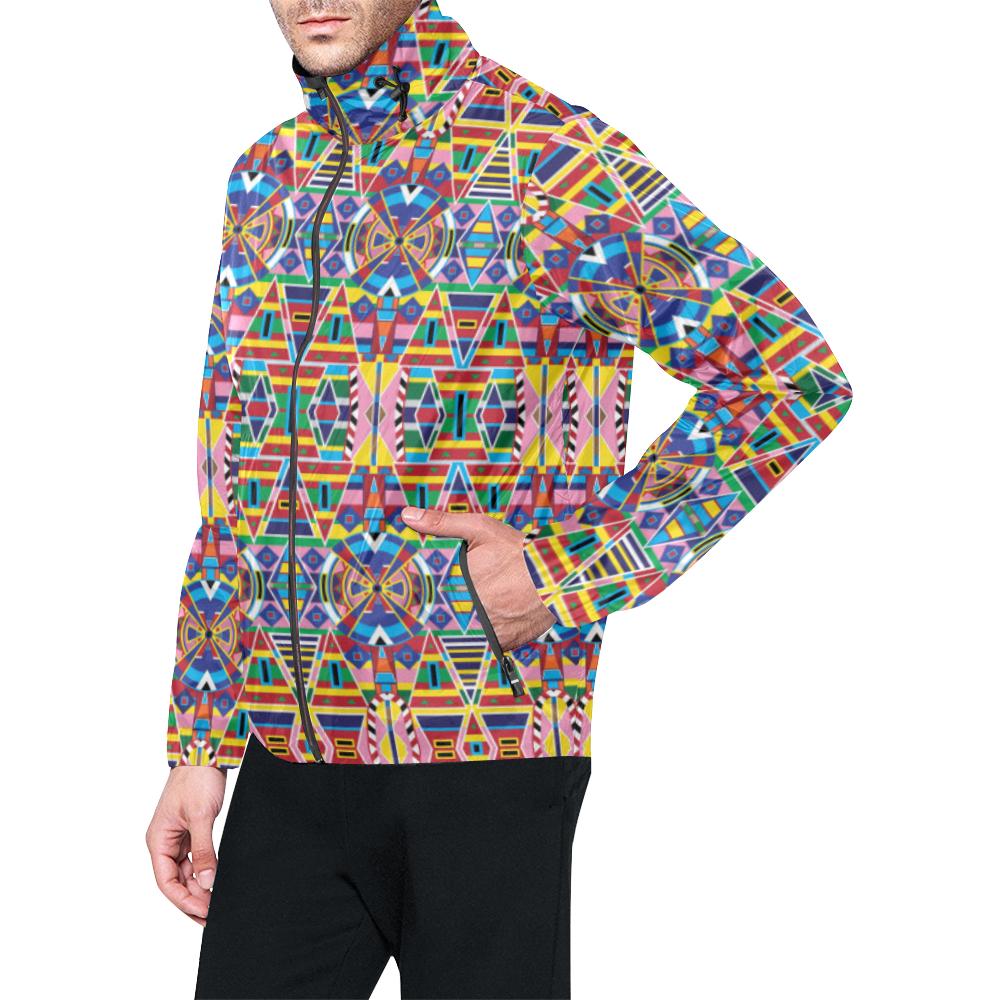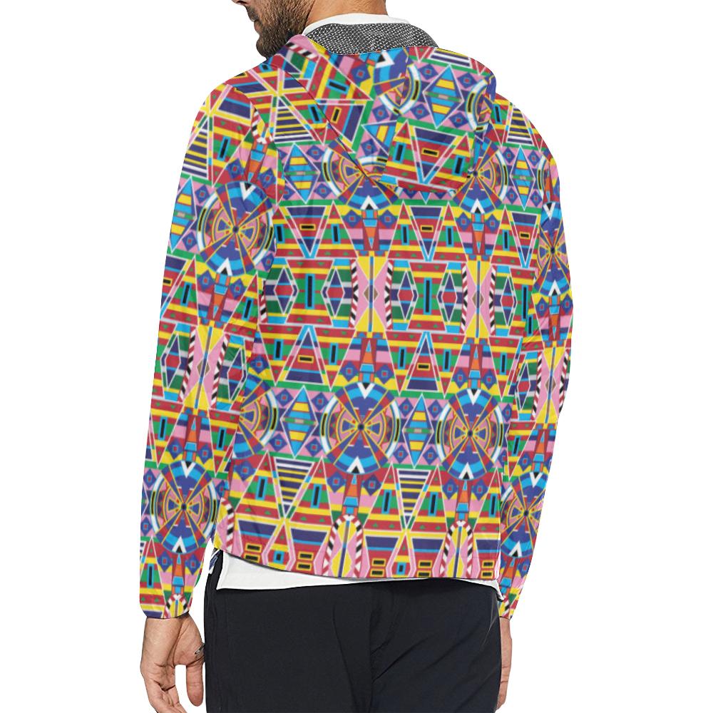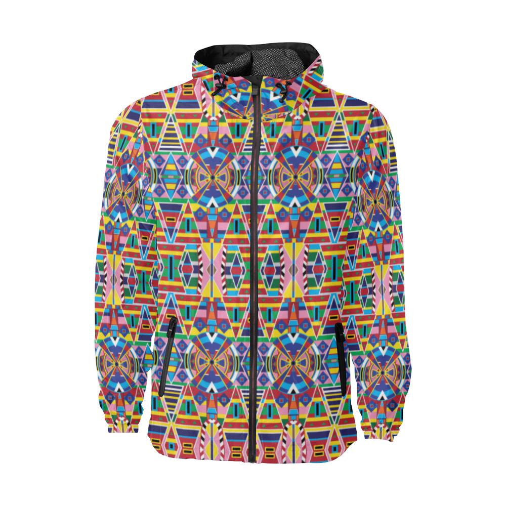 This all-over print windbreaker with a drawstring hood, elastic cuffs, and bottom hem
