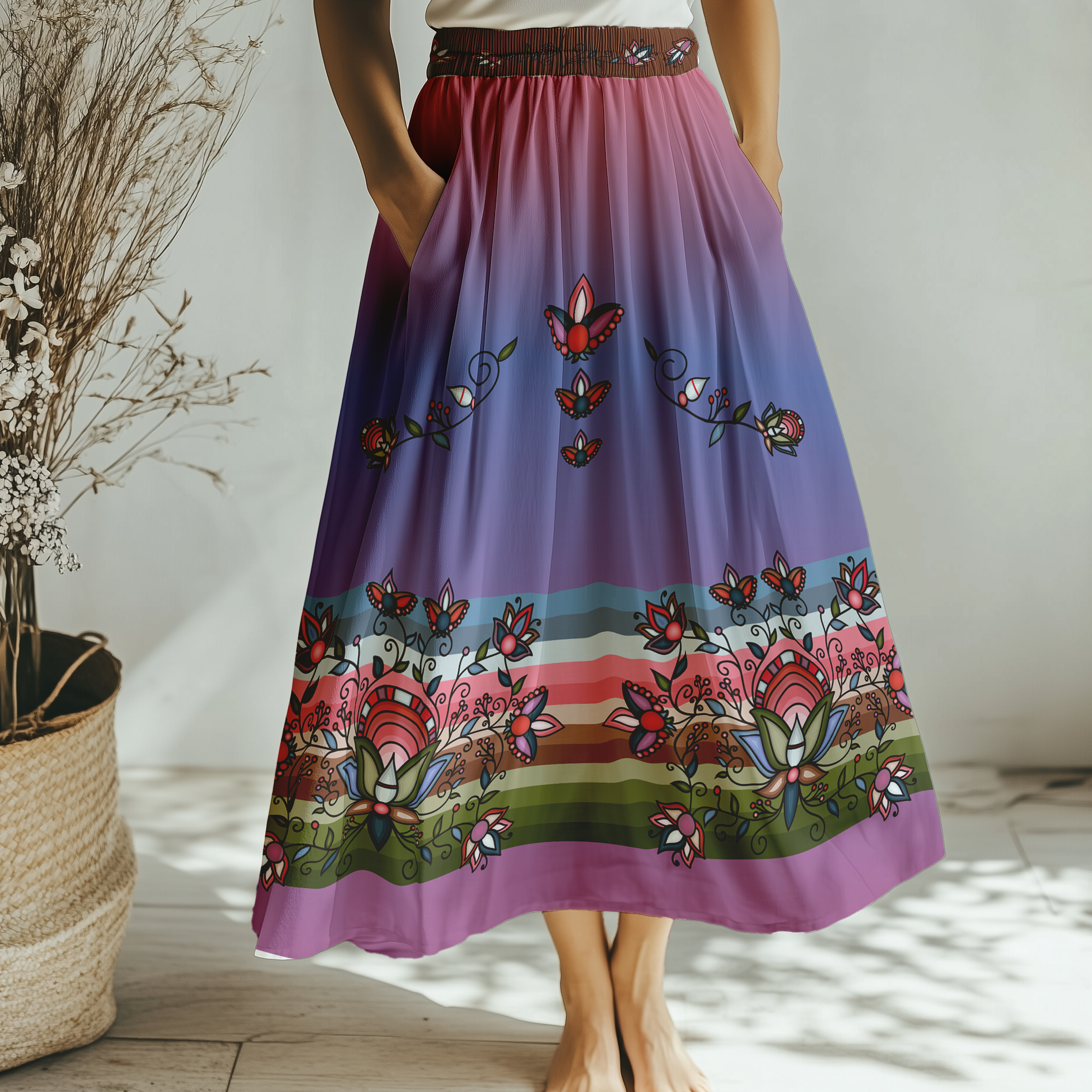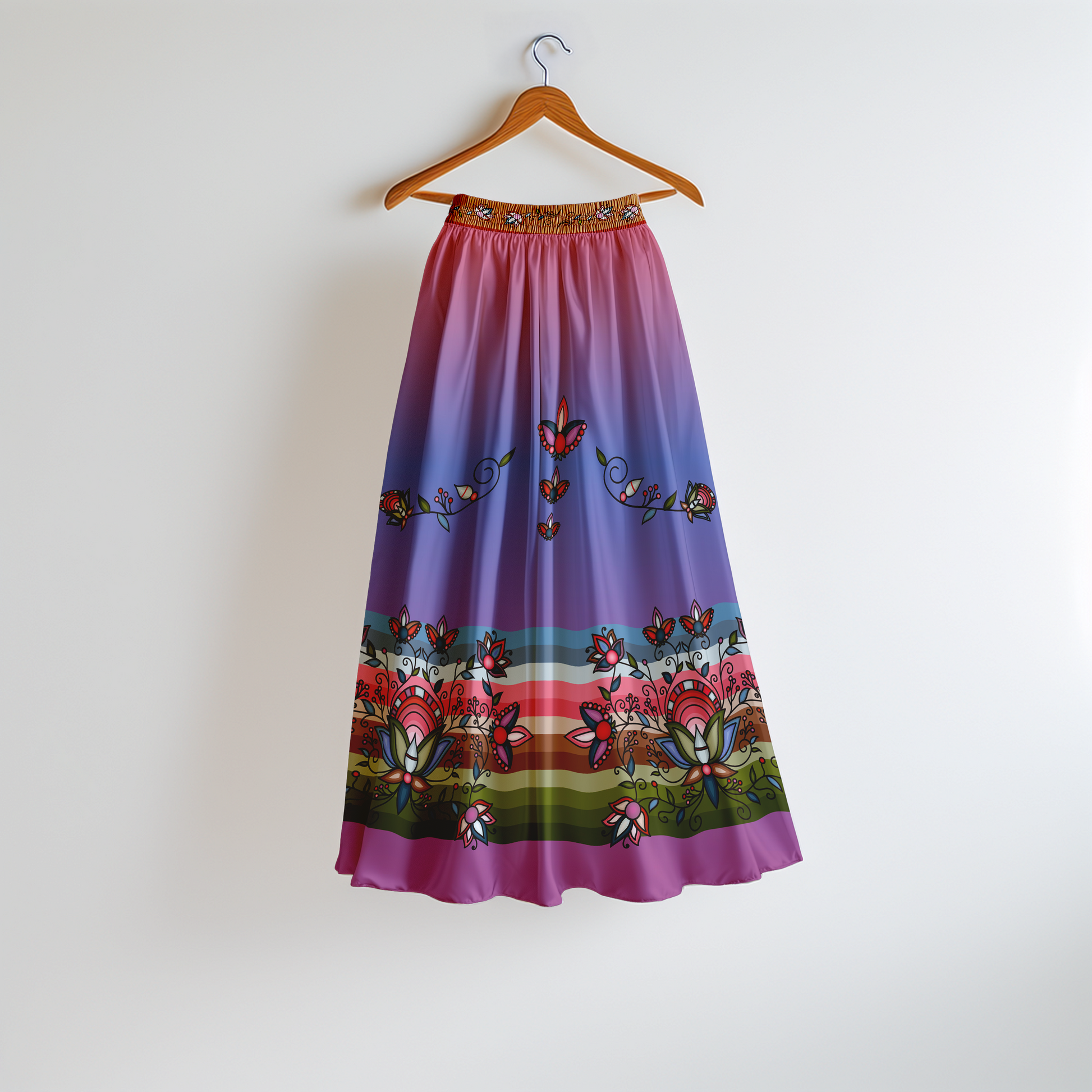 Our ankle-length skirts are designed with comfort, practicality, and Indigenous beauty in mind. Featuring a wide elastic waistband for a flattering and flexible fit, plus pockets (yes, real pockets!), these skirts are as functional as they are stunning.