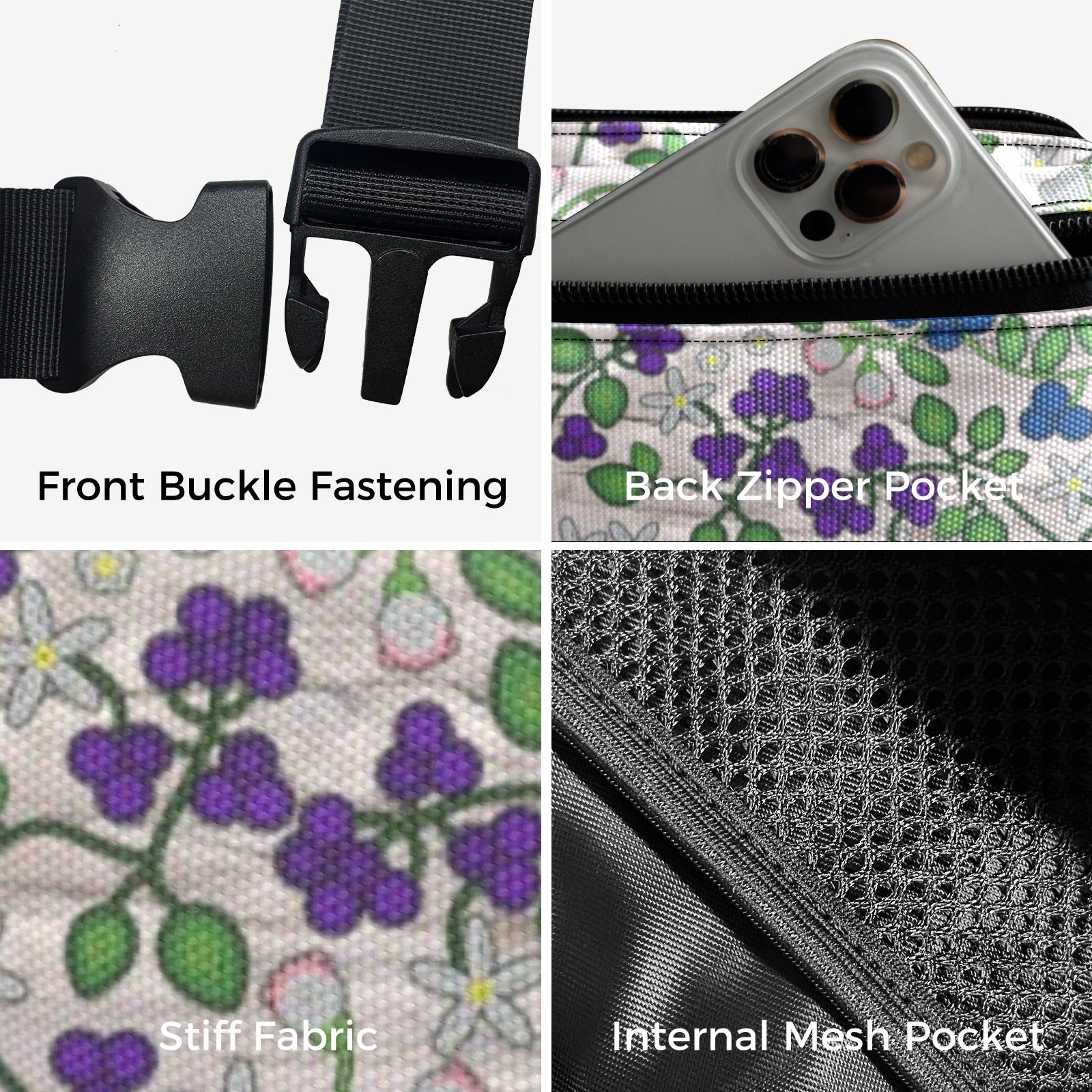 • Adjustable waist belt with plastic buckle for comfortable fit.