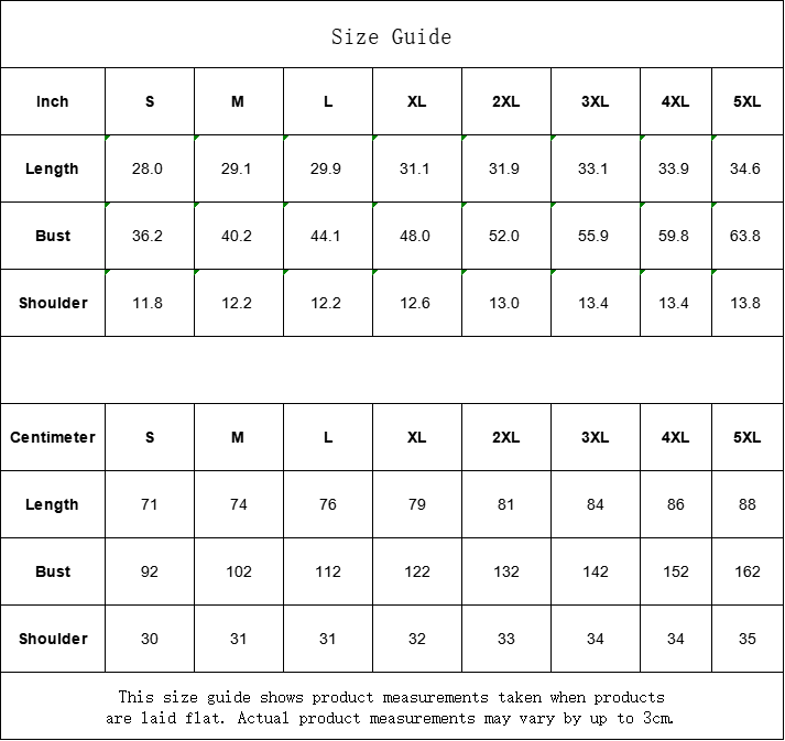 | Centimeter | S | M | L | XL | 2XL | 3XL | 4XL | 5XL |
