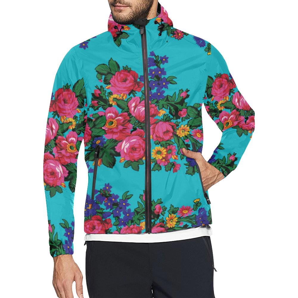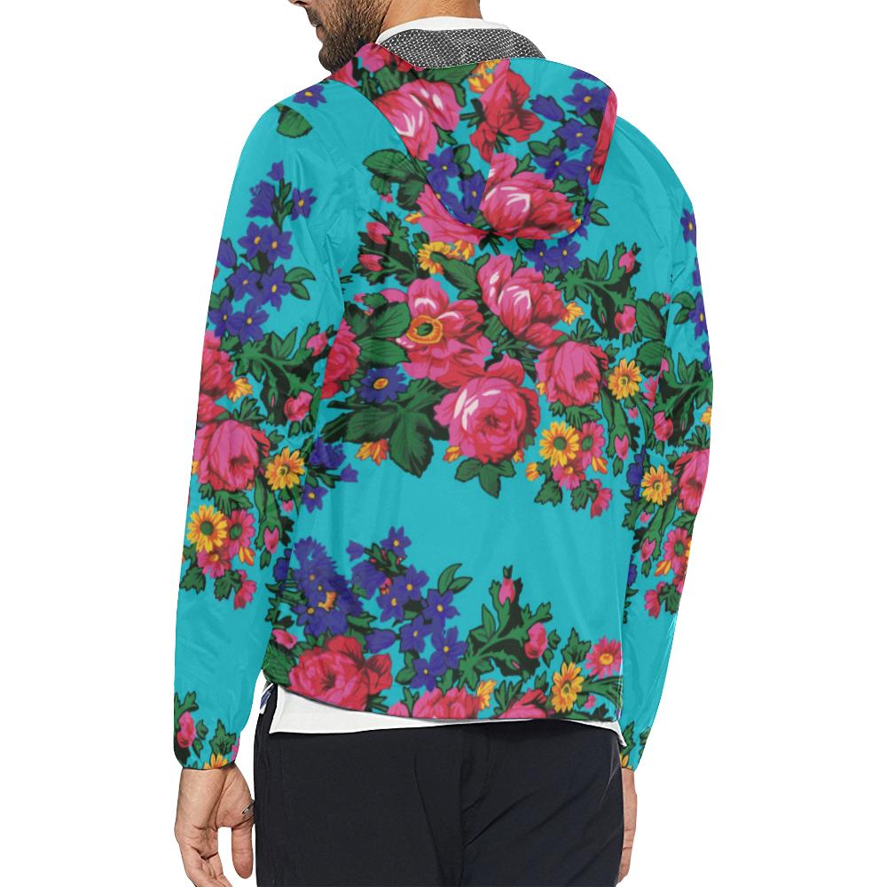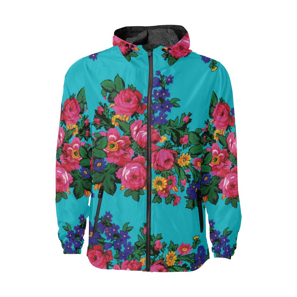 This all-over print windbreaker with a drawstring hood, elastic cuffs, and bottom hem