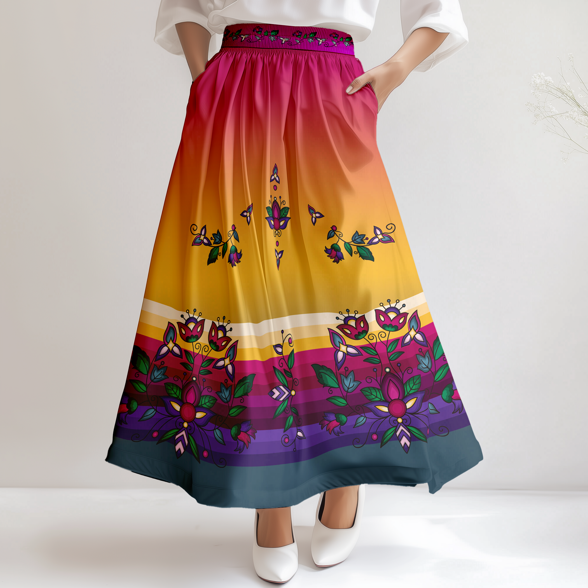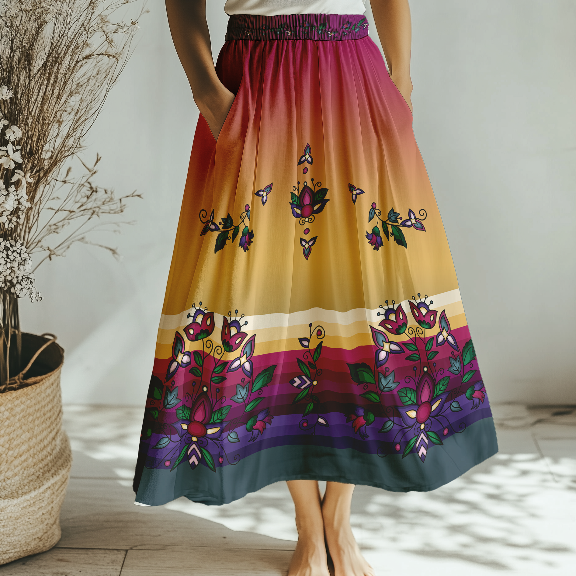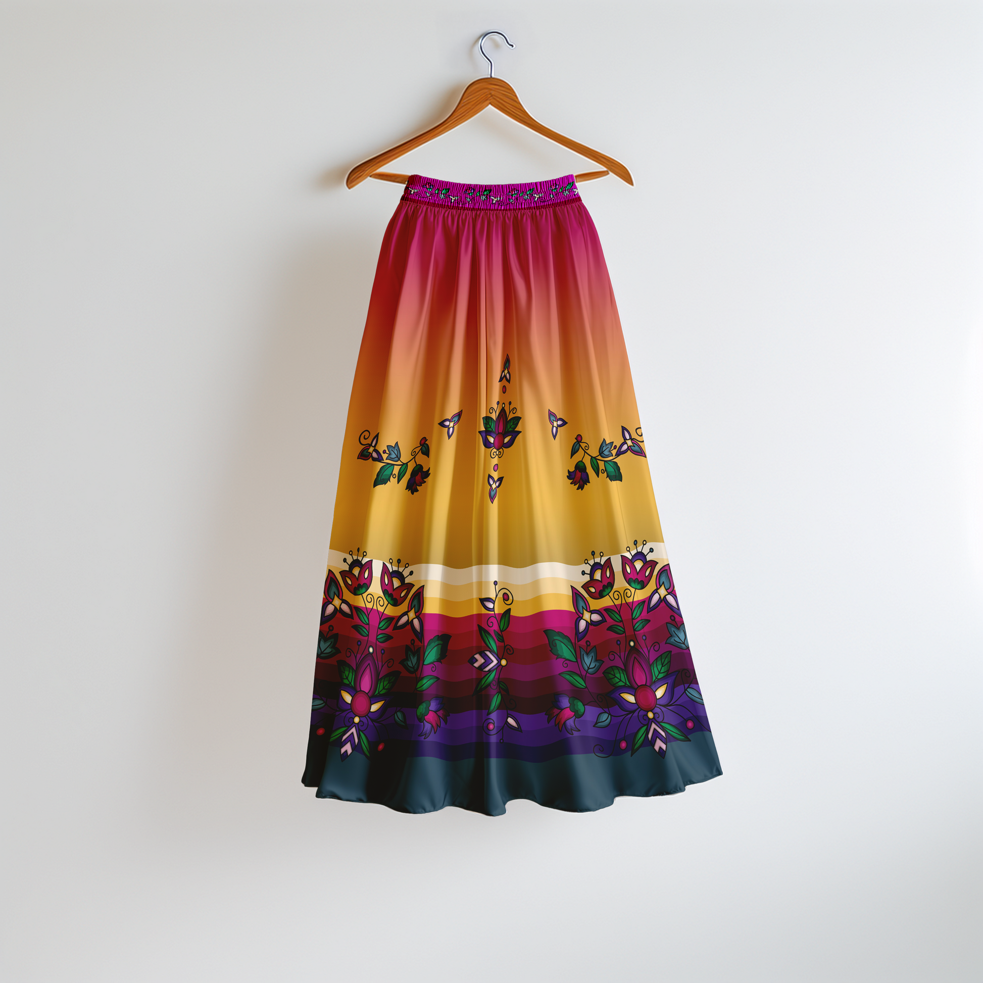 Our ankle-length skirts are designed with comfort, practicality, and Indigenous beauty in mind. Featuring a wide elastic waistband for a flattering and flexible fit, plus pockets (yes, real pockets!), these skirts are as functional as they are stunning.
